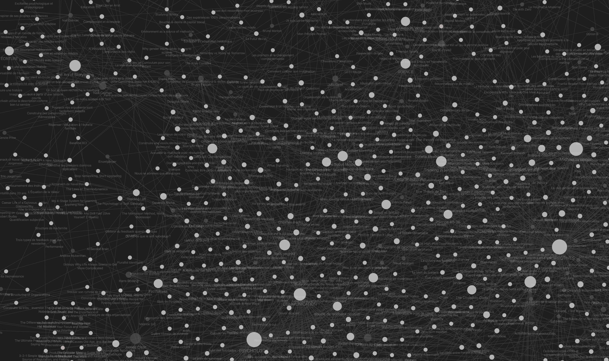 Et une solution miracle est tombée du ciel : le Second Brain de Tiago Forte. Très simplement, son système consiste à prendre des notes sur ses lectures et à les relier entre elles dans un "second cerveau". Chaque point est une note unique. Plus la note est reliée à d'autres notes, plus le point est large.